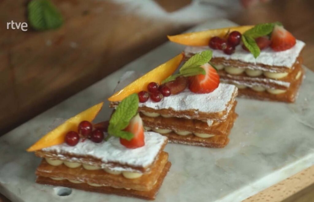 INGREDIENTES Masa de hojaldre 50 gr. de azúcar 50 gr. de nata 250 ml. de leche 3 yemas de huevo 20 gr. de harina de maíz 1 nuez de mantequilla 1/2 vaina de vainilla PREPARACIÓN HOJALDRE Con una regla, cortamos la masa de hojaldre en porciones iguales. Para que el hojaldre, caramelice, espolvoreamos una capa …